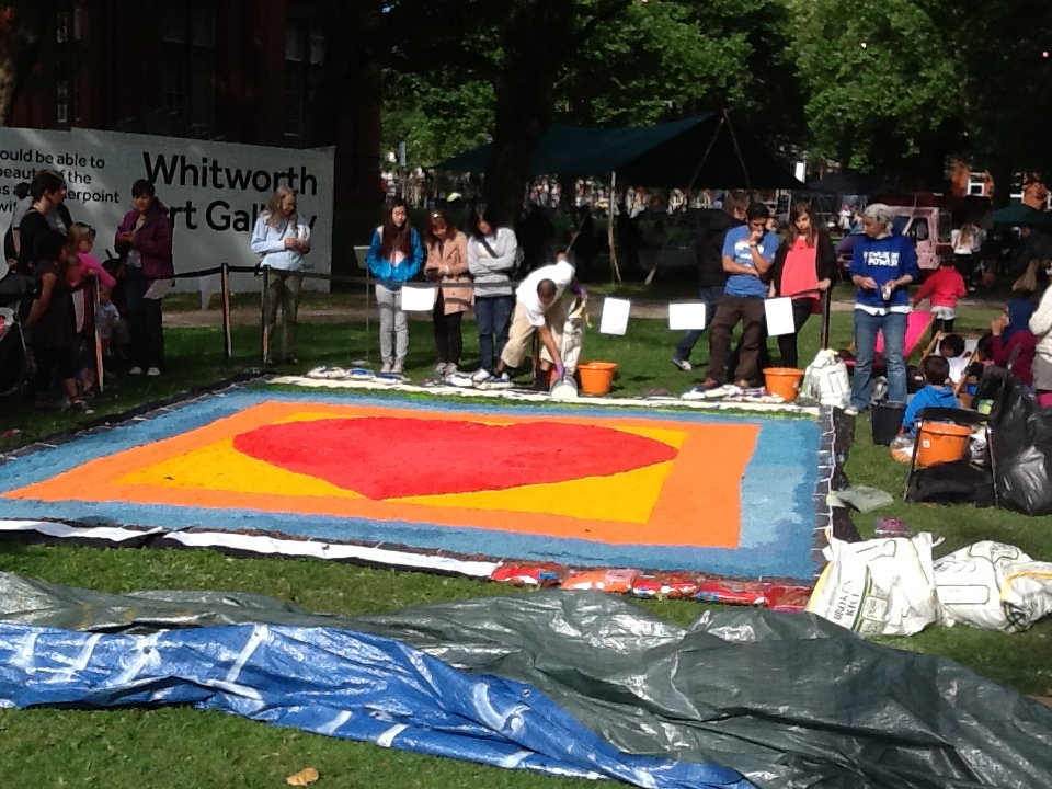 Artist Muzamil Choudhury used his creative resourcefulness to recreate Sir Peter Blake’s ‘I Love You’, one of the Whitworth’s most enjoyed artworks. In 2013, for the ‘Whitworth Weekending’ – a festival to say goodbye before the redevelopment of the gallery, Muzamil used foods, fabrics and spices found in nearby Rusholme to create his final piece.