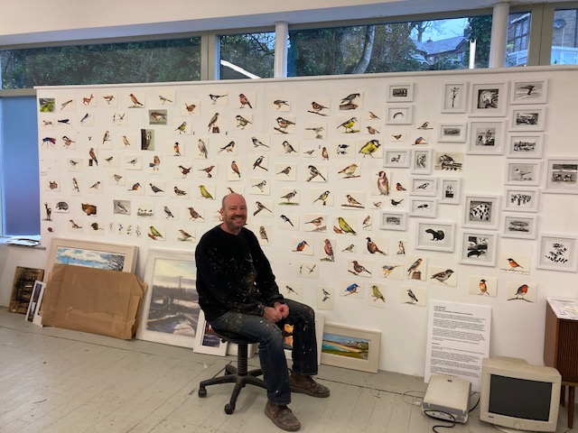 The slideshow features Alan Birch at the press in his printing studio, Jill Randall’s sculpture space complete with welding equipment and crane and Liam Spencer sits in front of his lockdown bird series of watercolours.