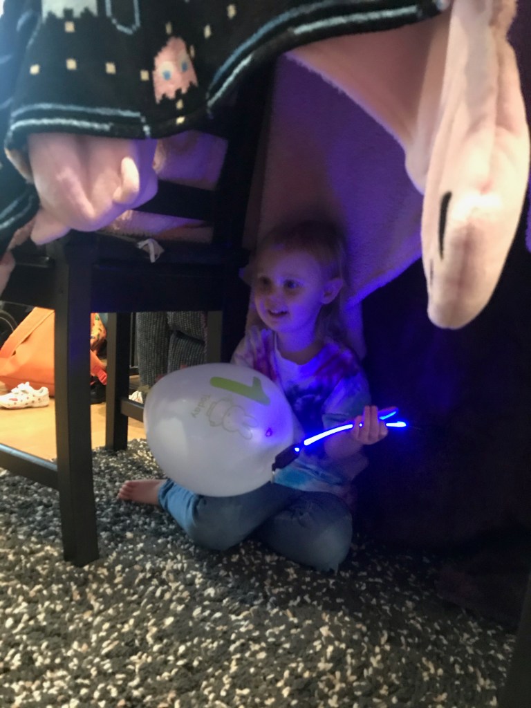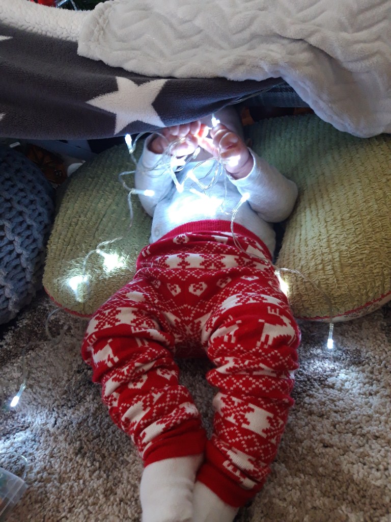 We left out the sheets, lights, lamp and torches and the children have loved continuing to explore since.