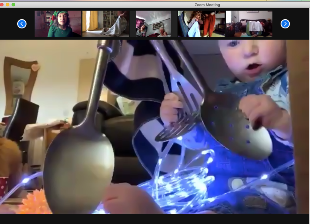 We always offer a bit of time at the end, after the ‘goodbye’ song where people can chat. There have been very sweet moments of children showing us their moves, toys, and art. Sometimes they even know other children and say ‘hi’ to them between their little Zoom rectangles. We’ve had friends and cousins in different homes getting to play ‘together’ through this medium.