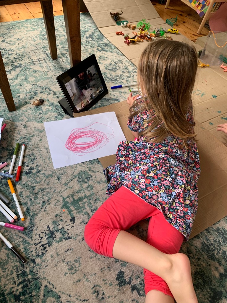An important element of PLAY Studio, when it is at the gallery, is the sense of support and community that the grown ups get from each other when they come together in a group. Seeing, connecting and interacting with other adults, albeit on a screen, seemed to help aliviate some of those feeling of isolation that parents can feel.