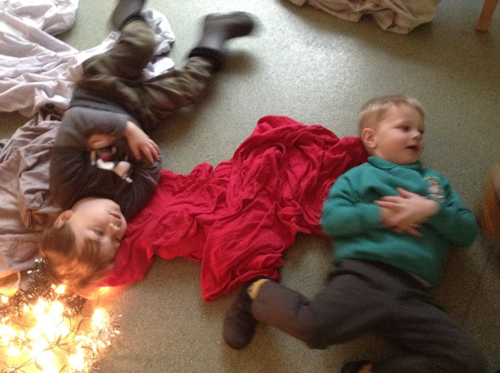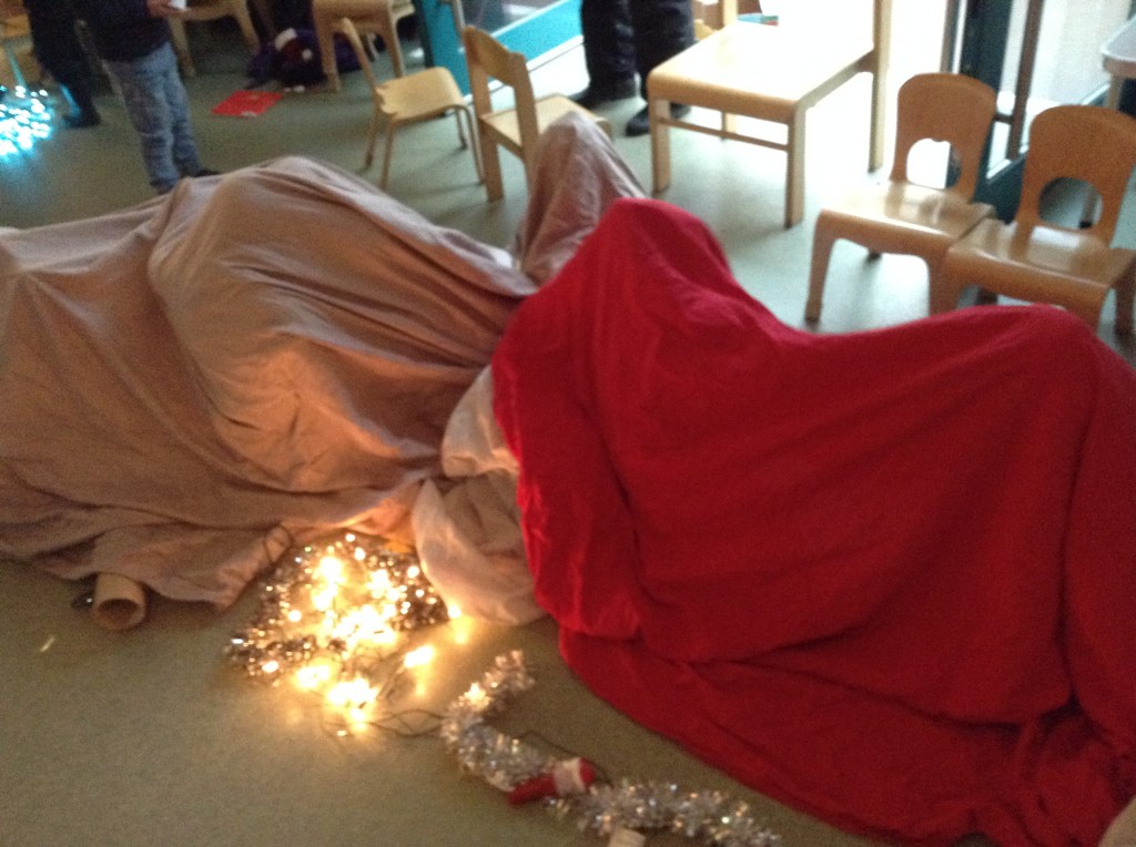 In this one we made dens, created dark spaces and explored light and shadow. We suggested materials to bring along which included large blankets, sheets, torches, fairy lights and shiny items from around house.