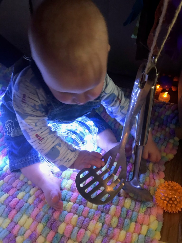 Before each session a list of suggested materials is sent out that parents/ carers can gather together and bring along to a session. These materials are always simple everyday objects that can be found around the house that encourage open ended, heuristic play. Objects include things like a large blanket, wooden spoons, kitchen utensils, fairy lights or torches, simple things that will stimulate babies’ senses and allow them to explore the world around them.