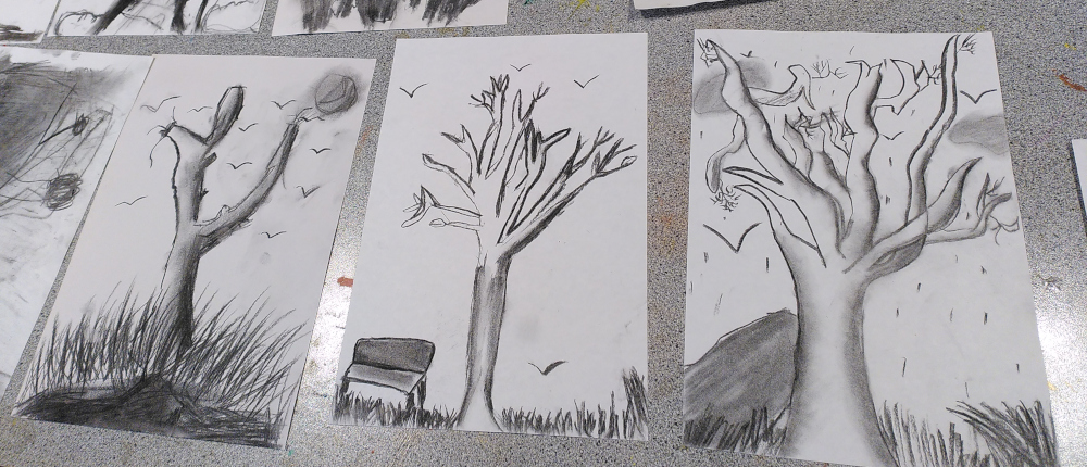 Now it was time to create some art. As it was the children’s first experience of using charcoal (a material derived, of course, from trees) I talked them through its characteristics, including its brittleness and tendency to smudge. I explained that we would be drawing the bare winter trees and encouraged them to think about contrast, line and form when creating their drawings. The children headed outside and spent considerable time and care working on their drawings in the open air. I asked them each to choose a particular tree to portray and to look at it carefully. Most of the group chose a real tree, but a few chose to draw Anya Gallaccio’s tree sculpture. I’m always amazed by the diversity of responses to creative tasks, and this workshop was no exception. Some of the children drew bold, dark forms, some drew complex, naturalistic arrangements of branches or explored the possibilities of shading – and some incorporated additional elements such as birds and foliage, often from their imaginations. It was great to see lots of confidence and enthusiasm from the children throughout the session, which I think was a memorable and valuable experience for us all!