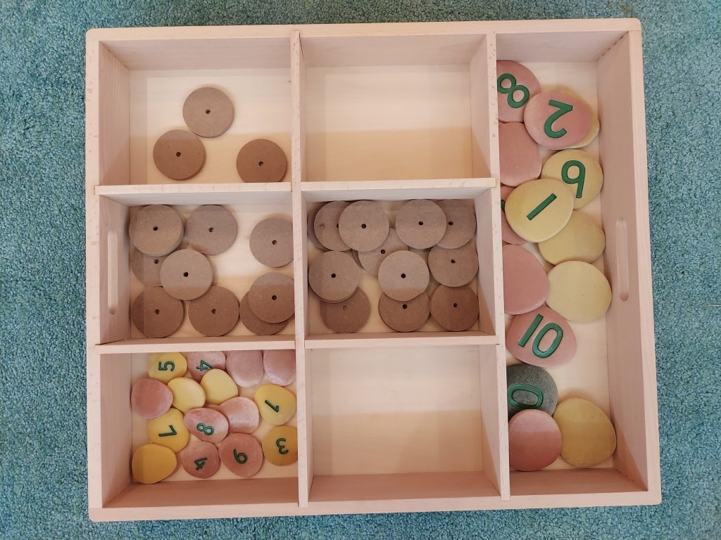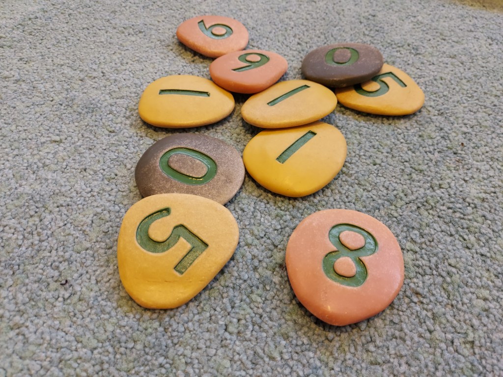Large sensory pebbles with numbers on them. Babies are naturally curious and love to explore their environment through touch and feel. Number pebbles provide a sensory experience as they satisfying to hold and explore. The tactile sensation of touching and holding the pebbles helps babies develop their fine motor skills. The numbers printed on the pebbles introduce babies to early numerical symbols and encourages early number recognition. Playing with the number pebbles provides an opportunity for language development too. Grown ups may relay the numbers to the child. This exposure to math-related language supports their cognitive development. Older siblings might like to start sorting the numbers in numerical order and even older siblings might test themselves with simple adding and substracting or ordering into odds and evens etc.
