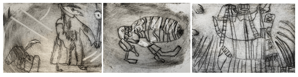 Members of the Age Friendly classes at the Whitworth explored the world of engraving, mixed media pieces and gelli printing at the gallery. The textile pieces of Shirley Craven, the prints of Paula Rego were used as starting points for the work